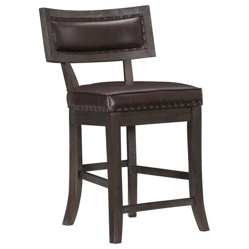 Designed for your homes rustic aesthetic, the Kinsale Collection provides an ample platform for your mealtime and social activities. The rectangular counter height tabletop is supported by a functional storage base, allowing for discrete placement of your tabletop accessories. Contoured-back, wood-framed, 24-inch height chairs feature nailhead accent and dark variegated brown bi-cast vinyl seats that perfectly complement the rustic look of the Kinsale collection.