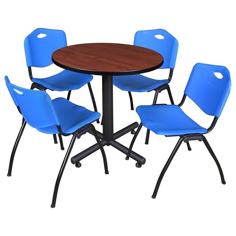 -Versatile table and chair set includes 30-inch round Kobe table and 4 Blue “M” Stack Chairs