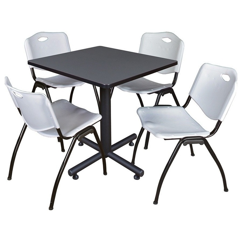 -Versatile table and chair set includes 30-inch square Kobe table and 4 Grey “M” Stack Chairs