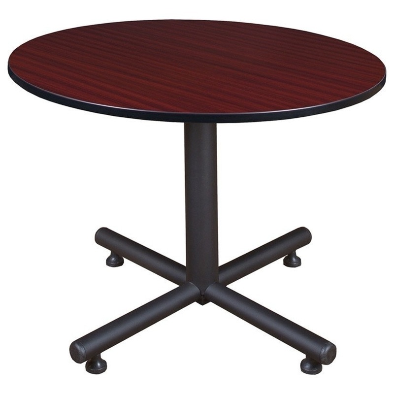 The elegant Kobe collection puts the class in classroom. These versatile tables are at home in stylish restaurant settings as well as classrooms, breakrooms and more. This 48-inch round table is constructed of a thermal fused melamine Mahogany laminate tabletop that is 1-inch thick and finished with a black T-Mold edge band. Laminates are scratch, stain and scald resistant and wipe clean easily. The base is constructed of a black tubular steel X-Base and is protected with a black powder coated finish for a uniform, matte finish. Adjustable glides on the bottom that raise the whole base off the ground give the Kobe collection an open, modern look. Kobe table bases are backed by a 10-Year Limited Manufacturer’s Warranty.