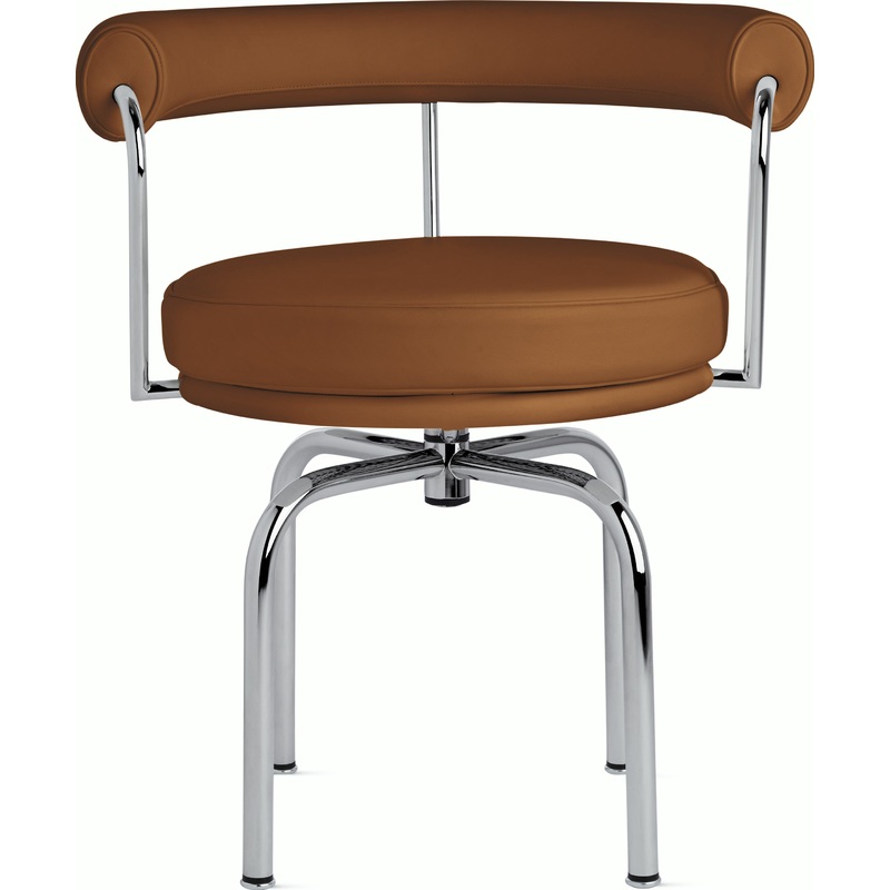 The LC7 Swivel Chair (1928) evolved from experiments that included wrapping inner tubes from tires around a steel frame. As the Le Corbusier group refined such trials, sensuous solutions took form. The LC7s padded seat is topped with a curved, amply padded