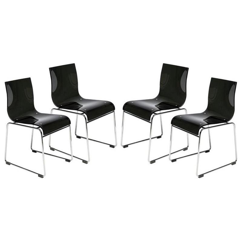 With a chrome-finished steel frame and heavy-duty acrylic seat, these minimalistic chairs are sturdily and dependably built. The seat top is transparent. Included for each chair are four black plastic floor protectors, which also stabilize the chair. Howev