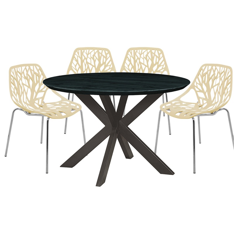 Item Description:The Ravenna Modern 5-Piece Dining Set is stylish and versatile furniture that combines contemporary design with functionality. This set is perfect for both the kitchen and dining room, providing a comfortable and visually appealing space for meals and gatherings. The modern dining chairs feature a unique cut-out design adding a touch of modern elegance to your dining space. Constructed with sturdy metal legs and finished with a sleek chrome coating, The stackable chairs allow for easy storage, making them ideal for compact spaces or situations where you need to maximize available room. The modern dining table is built with a round MDF wood top, providing a smooth and durable surface for meals and gatherings. With its attractive metal base, this dining table showcases a modern and eye-catching design that effortlessly complements any interior decor. The contemporary dining set is designed for hassle-free assembly, allowing you to effortlessly set up your dining area without any complexities or time-consuming processes.