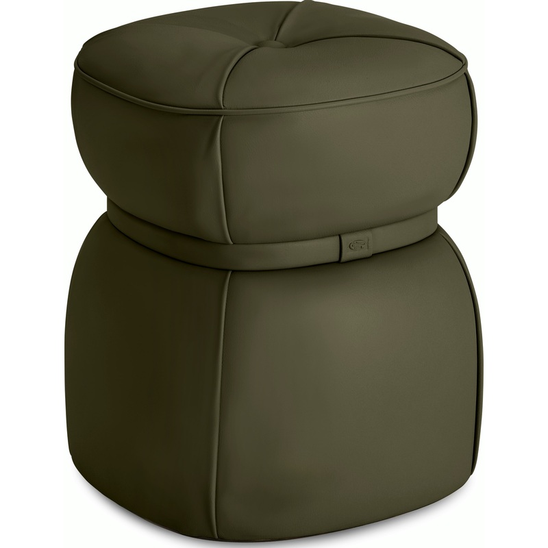 • In leather, the top is tufted with a center button and four diagonal folds extending outward.