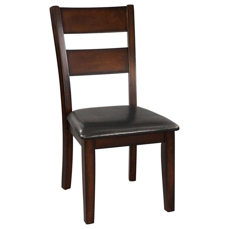 Transitionally styled for your home is the Mantello Collection. The dining height chairs cherry finish over mango veneer and classic styling will provide the perfect seat for your mealtime gatherings. Dark brown bi-cast vinyl covers the side chairs for complementing contrast to the woods finish.