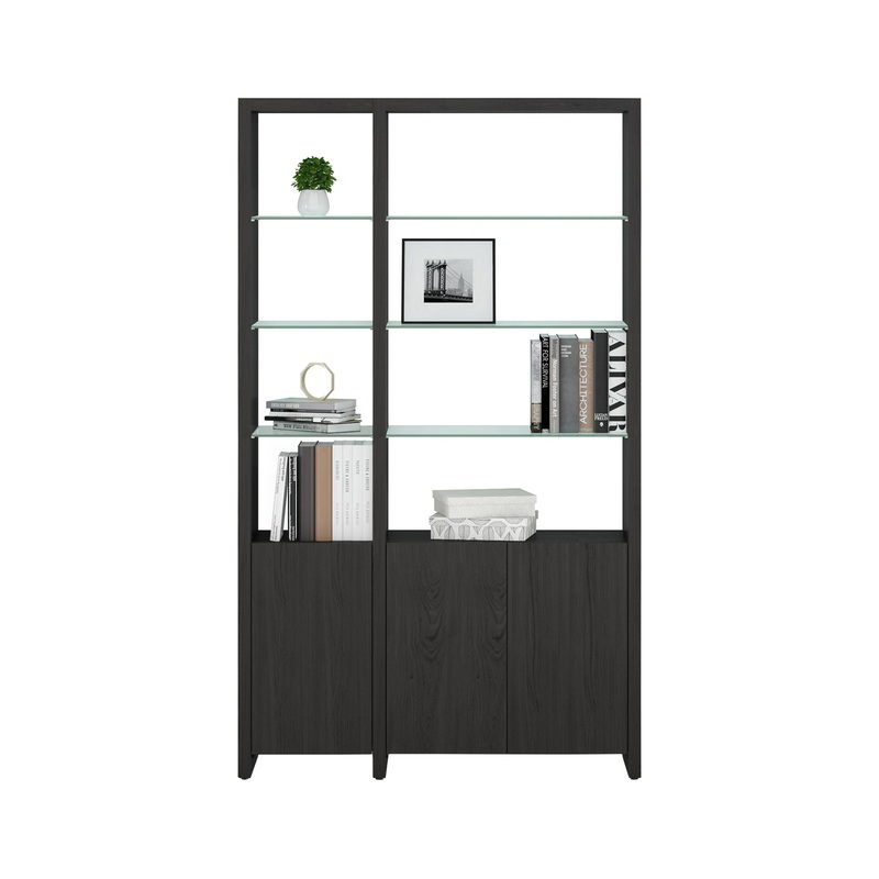 The Linea 2-Shelf System provides ample open and enclosed storage within a slim footprint. Fixed glass shelves float in the upper tier, ideal for a complete library or displaying a lifetime of treasures. Soft-close doors conceal an additional adjustable glass shelf, providing a convenient and concealed storage solution. An ideal wall system, Linea can also be used to create an attractive room divider, securely anchoring to a wall on one end. Perfect for display, storage, or simply dividing a room, Linea also pairs beautifully with pieces from other BDI media and office collections.