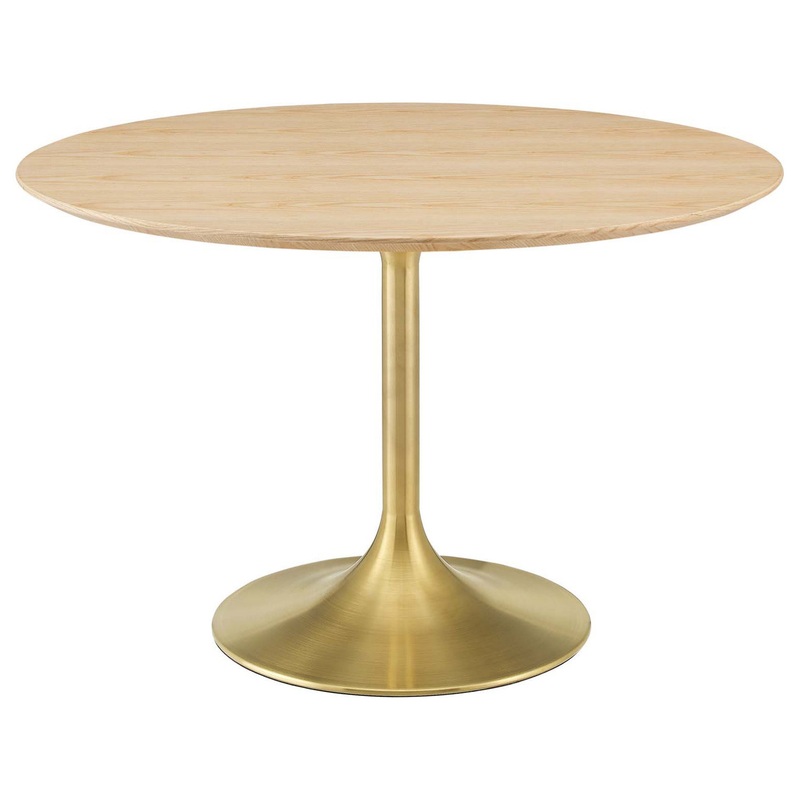 Reflecting a seamless organic shape and timeless form, the Lippa dining table has become a symbol of modernism for over the past 60 years. Before its release, homes were filled with clunky remnants of an industrial age long gone by. But in order to advance into the new world, homes first had to transition from the traditional square table, into a piece that connoted progress. The base and dimensions are true to the original specifications, while the table’s circular MDF top has an easy-to-clean wood grain veneer, and the metal tapered base features a brushed gold finish.