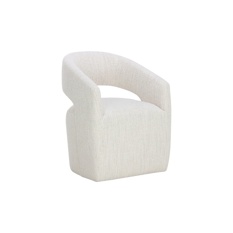 Gentle curves give the Lloret Wheeled Dining Armchair an elegantly defined silhouette. Fully upholstered in merino pearl performance fabric with a comfortable seat and casters for an easy glide. Performance fabric is moisture repellent, durable and easy to