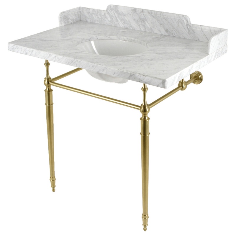 With a beautiful carrara marble counter top, this 36″ x 22″ console sink set with back and side splashes is a long lasting, durable, and elegant addition to your bathroom. A fabulous alternative where space is limited or tight making them friendly for the whole family. With different shades and natural designs, otherwise known as veining, no two sinks will be alike. Also for your convenience, anti-slip rubber pads are included with the brass legs to ensure steadiness. Water supply kit, drain assembly, and the faucet are sold separately. Kingston’s carrara marble tops are polished, but they are not sealed. Polished marble has a shiny surface and resists stains. Natural stone, even when polished, is still somewhat porous and does remain susceptible to etching by acidic compounds like fruit juice, vinegar, some cleaning solvents, etc. For customers that wish to further protect their investment the marble can be sealed. The following is intended solely for informational purposes. Kingston does not warranty nor accept liability for damages or other negative outcomes resulting from any treatment or coating applied to the countertop after purchase, whether applied by the customer or by a third party. For anyone unfamiliar with this nature of project, Kingston recommends consulting an experienced professional in your area. When looking for a sealant product, please be sure to seek a product specifically designed for use on polished marble, granite or other natural stone surfaces. Be sure to always avoid anything containing a citrus ingredient, acid ingredient, tung oil, linseed oil, or other natural oils. These can damage or discolor your marble.