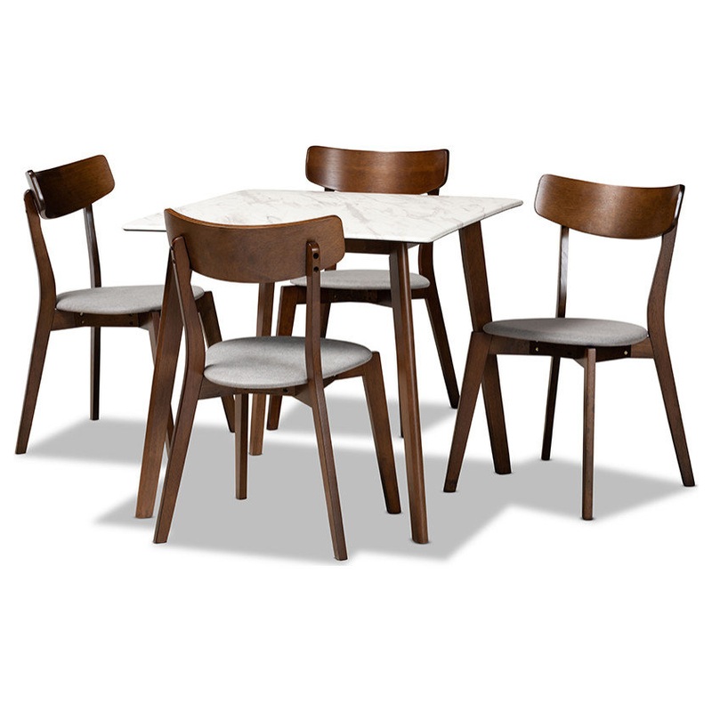 Efficient and comfortable design make the Loolas dining set an easy addition to any dining space. Made in Malaysia, this wooden set includes one dining table and four dining chairs. Each chair is foam padded and upholstered in an elegant light-tone fabric that complements the walnut brown finish on the wood. Curved wood craftsmanship provides excellent back support in a smooth and streamlined form. Requiring assembly, its faux marble tabletop lends a luxurious look, while splayed legs provide ample leg room for each member of the table. With its compact size, the Loolas dining set is well suited for dining rooms and nooks with limited space.