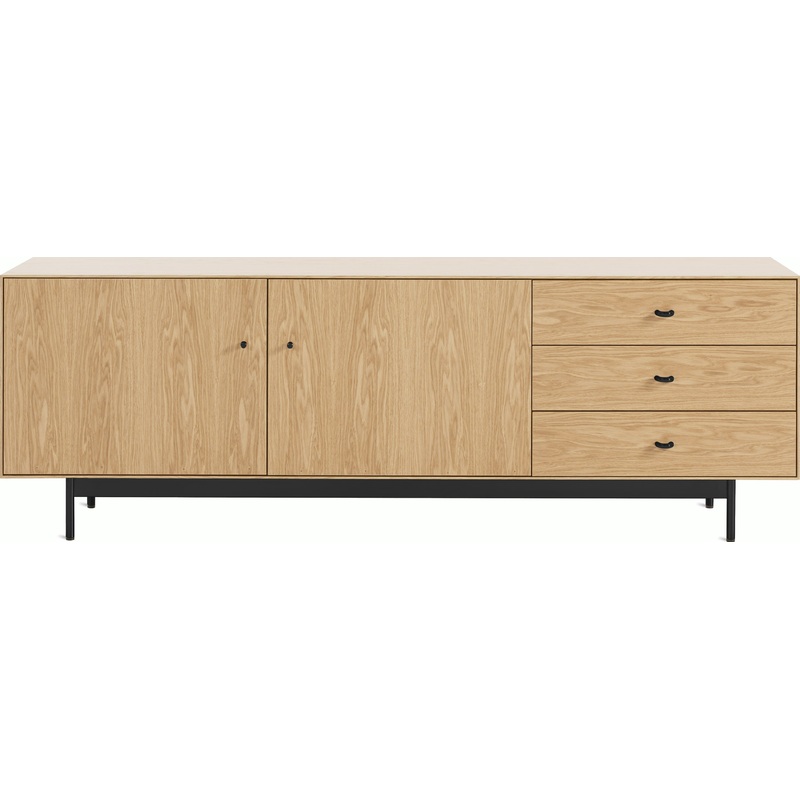 Lightness meets durability in the distinctive Loop Media Unit (2024), a DWR exclusive. Rotterdam-based designer Rachel Griffin achieved the airy look with slight proportions, stepped back edging and a slim metal base. Two doors and three sizable drawers ta