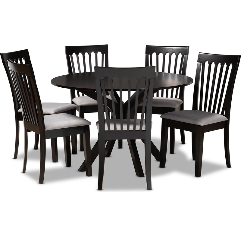 The Lore 7 PC Dining Set from Baxton Studio would be a great transitional addition to your home. The design of this transitional piece makes it a statement piece for years to come. The quality paired with the premium finish makes for a quality piece of furniture.