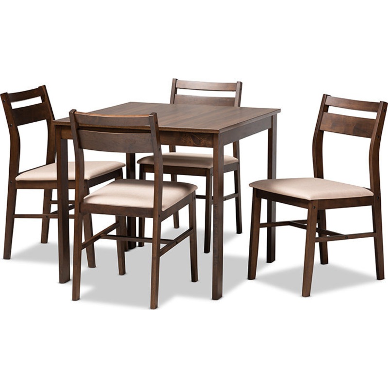 A clean design and neutral color palette make the Lovy dining set an effortless addition to any space. Constructed from solid rubberwood and engineered wood in a dark walnut finish, this dining set includes one table and four chairs. The table features a classic square top, ideal for playing cards or having a casual meal. Each chair is upholstered in a soft, foam-padded polyester fabric and is built with a slanted back for endless comfort. The compact size of the Lovy set makes it ideal for small kitchens and dining rooms. For added convenience, all five pieces in the set will arrive in one box. The Lovy dining set is made in Malaysia and requires assembly.