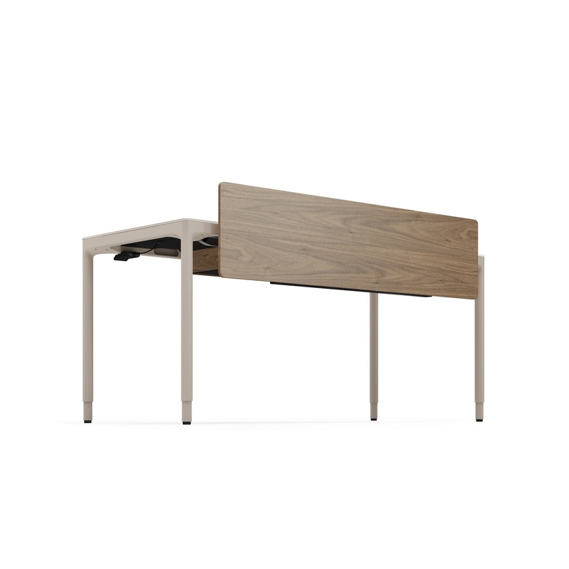 Mounted directly to the back of the desk, the panel provides subtle division and modesty, helping to define the workspace without closing it off. Its floating design allows cables to pass cleanly behind the desk, while an integrated metal trough keeps wires and power strips neatly organized and out of sight.