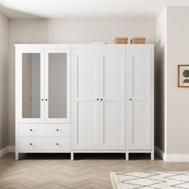 The Lynton 5 Door Wardrobe is the perfect storage solution for larger bedrooms or those requiring a lot of storage space. This wardrobe has 3 hanging rails within spacious cabinet space as well as 2 large drawers, providing more than enough space to store dresses, suits, folded clothes, accessories, shoes, and other items. This Lynton wardrobe has 2 mirrored fronts and has a timeless painted finish to look stylish for years to come.