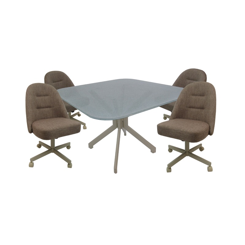 The M-235 Dinette set has a 48 inch Crackle or Clear Glass Top on a metal frame. Featuring a swivel powder coated metal framed caster chair with arms. Custom vinyl or fabric upholstered seat and back. Perfect for indoor use. All welded frame without any bo