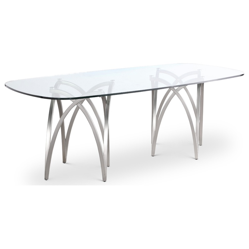 Gather the gang and seat them in elegance around the spacious confines of this Madelyn dining table. This table offers oodles of elbow room for diners to get comfortable over meals large and small. The thick-cut glass top offers a sophisticated take that elevates dining to the next level while a brushed chrome finish on the iron metal frame ensures an affluent look that diners can really appreciate. Pair the table with the matching chair from the same collection for a cohesive finish.