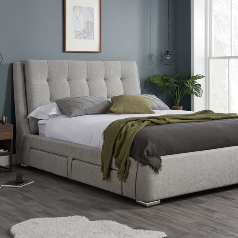 Perfect for adding a comfortable and stylish addition to your bedroom, this Madison bedstead is glamourous and ensures you get a good night’s sleep. In a modern grey colourway, this bedstead compliments any bedroom interior and bedding and its timeless design means you can keep it for years and years. Crafted with a low, sprung-slatted frame with four storage drawers, this easy to assemble textured grey bedstead features a square, deep-buttoned headboard and is available in a choice of sizes.