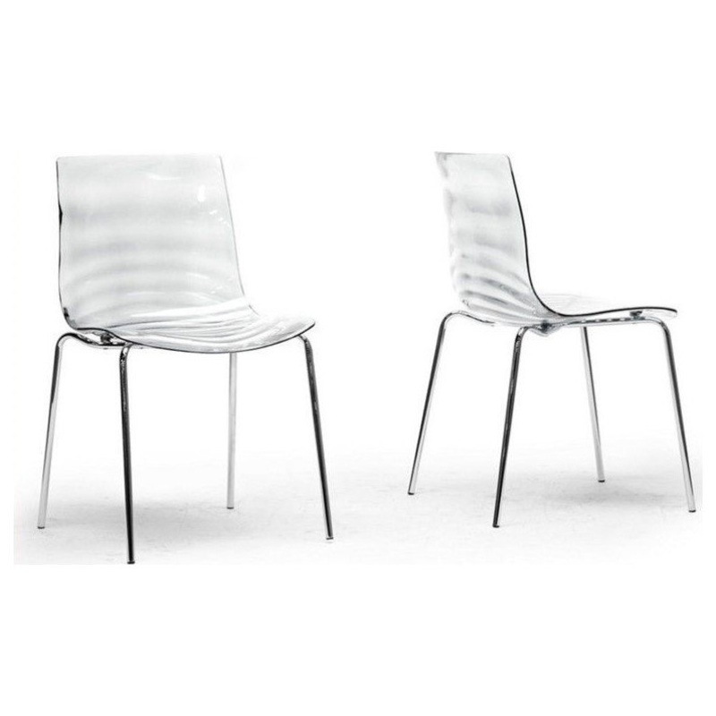 Calm waters. The tranquility of a secluded lake. The Marisse Chair embodies the best of an aquatic haven. This designer dining chair features Chinese-built construction of transparent clear polycarbonate plastic atop chrome-plated steel legs with non-marking feet. The seat features a ripple-effect bottom surface so the seat itself stays smooth for comfortable lounging. The Marisse Chair does not stack, requires assembly, and should be wiped clean with a damp cloth. A transparent blue option is also available (sold separately).