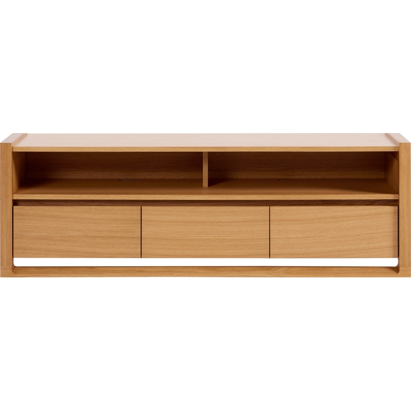 The Matera Media Unit (2024) is a beautifully crafted yet functional addition to designer Sean Yoos popular Matera collection, conceived when he was living in Matera, Italy. The multifunctional cabinet features a solid oak or walnut frame. Its spacious shelves and handle-free, soft-closing drawers are seamlessly veneered in a running match-wood grain. Beveled edges and exposed-slot mortise-and-tenon corner joints complete its clean profile; a sled base lends an airy feel. Choose from two sizes: the 60″ with three drawers, or the 80″ with four. Space for routing cords to exit through the base is included. Made in Malaysia.