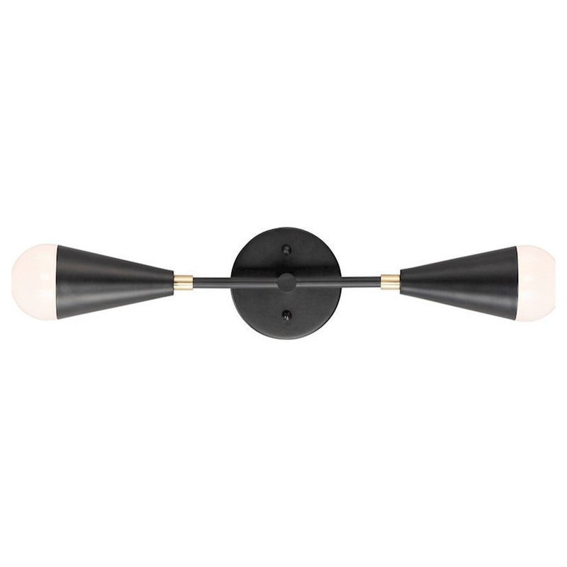 A classic mid-century look, the Lovell collection features two sizes of sputnik chandeliers and streamlined sconces perfect for bath vanity applications. Available in a Black/Satin Brass finish combination. Light bulbs nest inside the metal cones to become an element of the design.