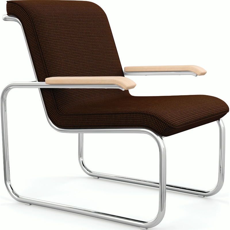 Marcel Breuers MB Lounge Chair (1929) represents part of the architects extensive work using tubular steel, a revolutionary material in furniture construction time of inception. In contrast to the Wassily Chair one of Breuers best-known designs the MB Lounge Chair features a seemingly continuous free-floating frame, simultaneously reflecting both strength and elegance. It combines an upholstered foam cushion supported by horizontal metal springs that provide slight give, along with contrasting wooden armrests.