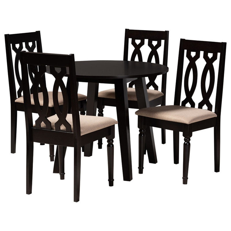 Elegance and comfort come together with the Medea dining set. Made in Malaysia, the Medea includes four chairs and one table constructed from sturdy wood finished in a rich dark brown. Each chair is fitted with a foam-padded cushion upholstered in a smooth sand tone fabric and features a unique cut-out design on its back. Requiring assembly, the circular tabletop allows ample elbow room for each member of the table. Ideal for both casual and formal occasions, the Medea dining set easily updates the modern home.