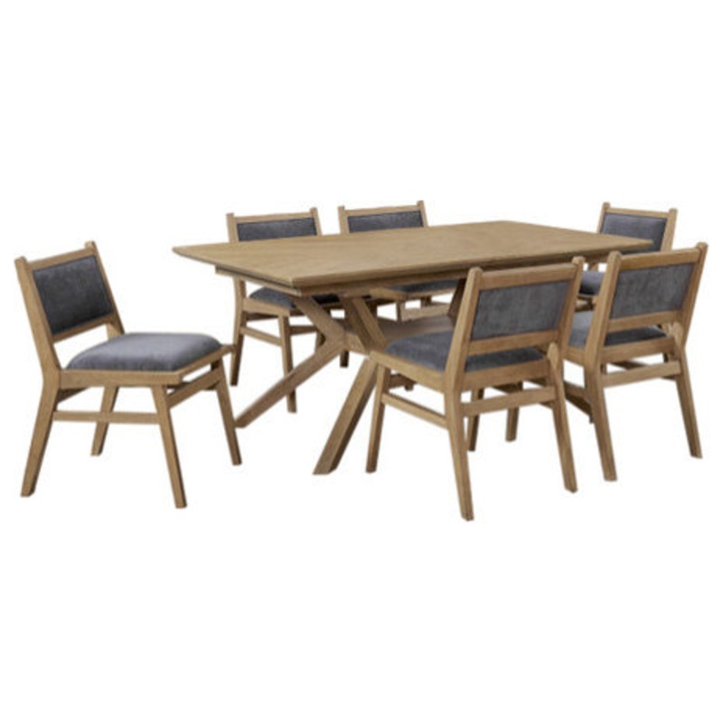 The Shelby dining collection honors classic mid-century design. Its rich caramel finish highlights the veneer patterns and emphasizes the natural beauty of this exotic wood. Angle-backed chairs are simple and comfortable capturing the essence of the minimalist era. Luxuriously soft dusty blue fabric adds color and invites you to relax and enjoy the moment.
