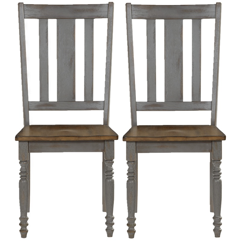These dining chairs have a casual look that works perfectly with today's farmhouse styles. The combination an Oak finished wood seat and Brushed Gray finished frame is stylish and easy. Turned style legs and a slat back finish off this chair design. -Beaut