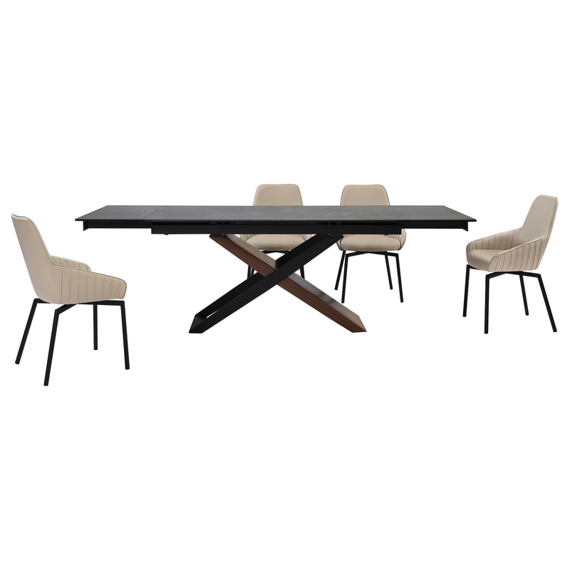 Bring friends and family together in a stylish fashion with the Milena Shilo 5 Piece Extendable Dining Set with Faux Leather Chairs. This 5 piece dining set includes 1 extendable Milena dining table and 4 Shilo faux leather swivel dining chairs. The refined and shapely silhouette of the kitchen chair is updated with stunning details to amp up the style of your home. The back and arms showcase clean lines and sleek curves to attain a sophisticated appeal. A stunning channel stitch detail on the arms adds charm and character to our modern dining chair. It is perched upon slender black metallic legs to serve as a welcoming and chic addition. The dining table chair includes a high back that elegantly swoops down to hug the back. Finished off with a generously cushioned seat, the dining room chair offers exceptional comfort and support. It can bring style and comfort anywhere from your kitchen, lounge, dining area, or home office. The Shilo accent chair also includes a 180 – degree swivel function enabling you to enjoy your meals and conversations to the fullest. It is upholstered in UV and stain-resistant faux leather which does not crack or fade easily to provide easy care and maintenance. With clean lines and dramatic construction, our long dining table serves as a stunning focal point. Its linear, rectangular tabletop is crafted from sintered shadow stone for a versatile and sophisticated appeal. A durable yet elegant alternative to quartz, this tabletop is resistant to etching, scratches, burns, and stains. It is perched upon a cross-shaped base to capture the eye. The chunky wooden leg is covered in walnut veneer, creating a visual contrast with the airy black wooden frame. Our chic and stylish dining table can easily extend to comfortably seat up to six to eight individuals. Available in 5 or 7 piece set configurations, this beautiful 5 piece extendable dining set features a shadow stone, walnut and black wood veneer table and your choice of taupe gray or champagne faux leather chairs.