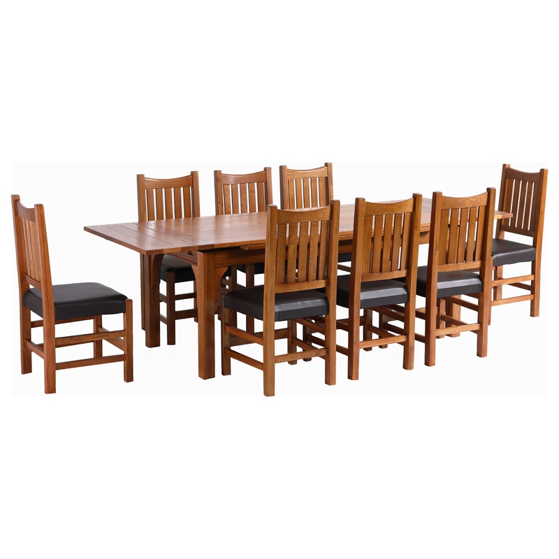 Our Mission and Arts & Crafts style furniture is made with attention to detail and expertise like that of 100 year old Stickley. -Solid oak and quarter sawn white oak with lacquer finish -Michael's Cherry stain -Pull out leaves on either end, self store un