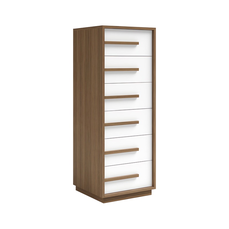The Mobican Nuria Narrow Chest is a wonderfully sleek, minimalist vertical storage solution that excels where space is limited. The Nuria is made by skilled Canadian carpenters from oak or walnut and premium veneers, with your choice of all wood or contrasting coloured drawers. This piece boasts 6 soft closing drawers with eye-catching wood handles, and is available with a finished back at your discretion.