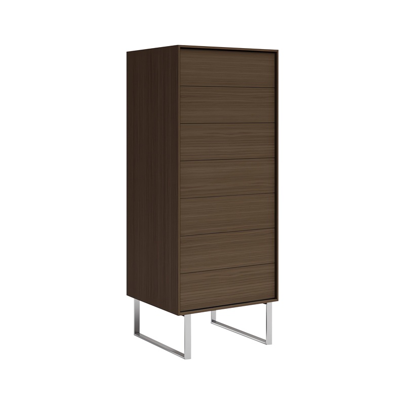 The Mobican Ophelia Narrow Chest pairs a space-saving vertical design with impeccable contemporary style. The Ophelia is handmade in Canada from oak or walnut and quality veneers, with 7 drawers mounted on push to open slides to keep the aesthetic perfectly uncluttered. The modern metal legs are available in black or brushed nickel finishes to complement nearly any decor. This piece is available with an optional insert, providing open storage space in place of the top drawer.
