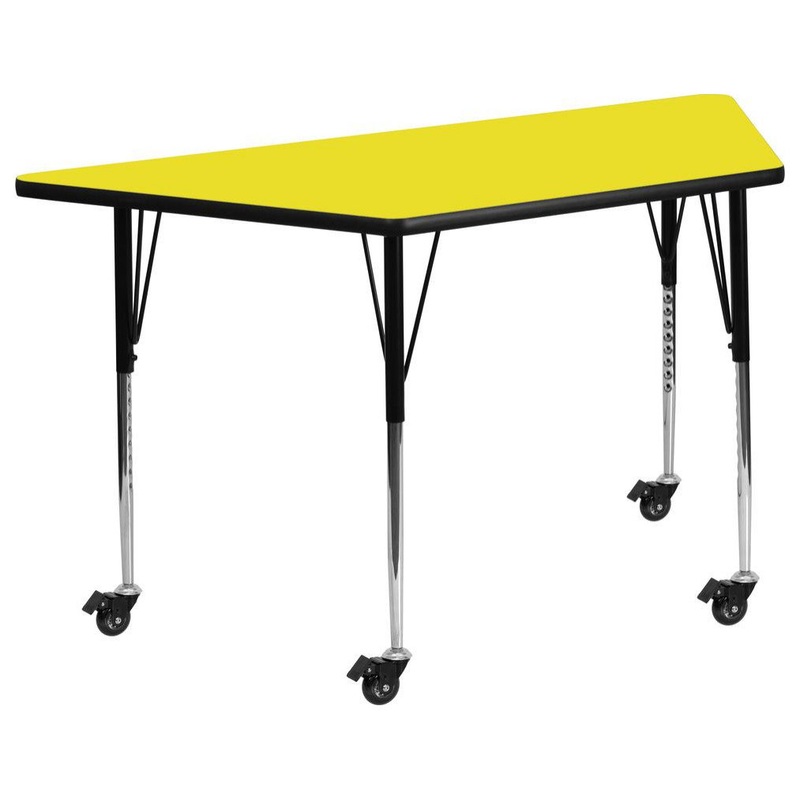 The Trapezoid Activity Table is a versatile option for school classrooms, corporate training centers and your home. Enhance collaborative learning by grouping tables together. It will accommodate children of all ages, from 1st grade to adult. It features a 22.5W x 45L high pressure scratch, stain and warp resistant laminate top with a black edge band and 16 gauge tubular steel legs for increased stability. The top incorporates a protective underside backing sheet to prevent moisture absorption and warping. An attractive black powder coated finish protects the upper legs from scratches and height adjustable chrome lower legs give you the flexibility to raise or lower the table a full 9 in 1 increments. Casters allow you to easily move the table around and then lock into place. This activity table provides a durable work surface for anything from computer labs to project meetings to laying out fabric in your sewing room.
