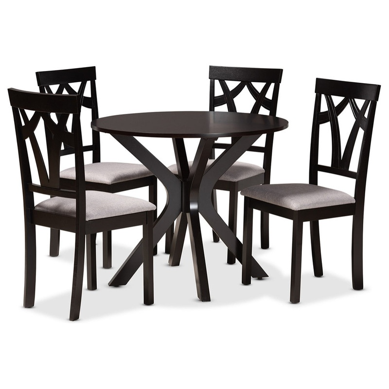 Rich wood tones and plush seating make the 5-piece dining set a dynamic upgrade to any dining space. Made in Malaysia, this set includes four chairs and one table crafted from sturdy wood. Each seat is padded with soft foam and upholstered in smooth fabric for lavish comfort with every meal. Requiring assembly, the 5-piece dining set features a broad, circular tabletop that comfortably seats four. Stunning cut-out backrests lend a contemporary touch, making the dining set a standout addition to any space.