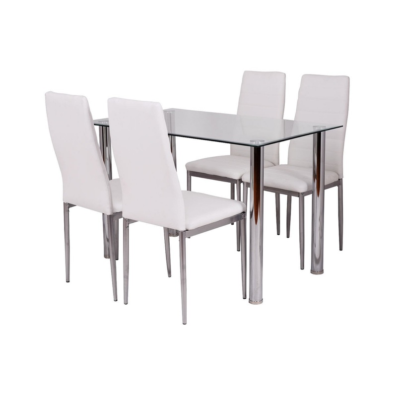 Add a fashion style to your kitchen or dining room with this stylish and functional 5-piece dining chair set. The dining set includes a sturdy rectangular table and four arm-less chairs. The dining table has a durable and sturdy tempered glass top and powder-coated steel leg, which is strong for long-term use. The clear and bright glass top adds a modern feel and it is very easy to clean. The chairs are upholstered with soft sponge that gives you more comfortable sitting enjoyment during a long time family dinner. Whether you are looking for extra seating in your breakfast nook or dining room or use it as an entertaining station, this 5-piece dining set is the best choice.