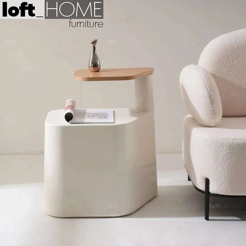 Our Cream Wood Side Table TIRAMISU combines modern design and practicality. With its rotating tabletop and crisp white base, it effortlessly adds a contemporary touch to your decor. It's the perfect blend of style and functionality.
