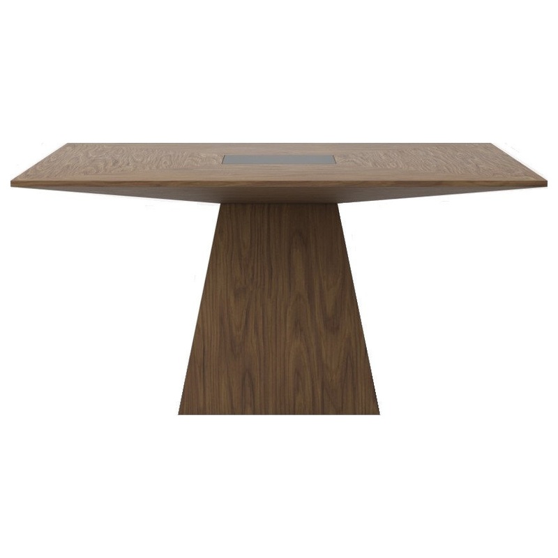 -Cora is a Modern Square Dining Table with Pedestal Base in Walnut and Black Tempered Glass. Perfect for dining conversations and smaller dining rooms.