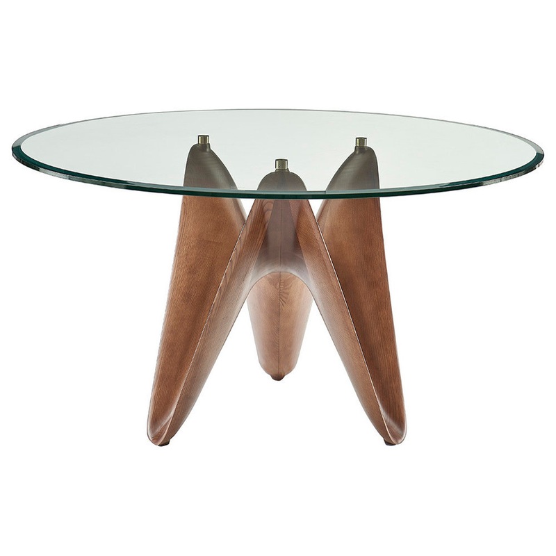The Seguin Dining Table is a stylish mid-century table, perfect for entertaining. The walnut finish of the architectural base pairs perfectly with the clear round glass top. Pair with a mid-century modern dining chair and contemporary accents. This unique