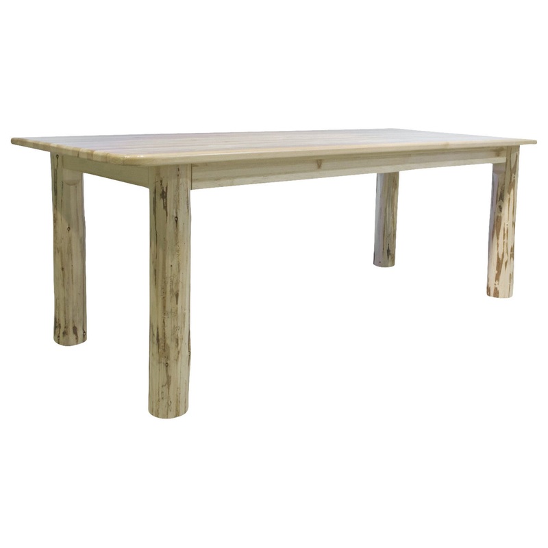 Treat your family to this classic four post dining table. Handcrafted using solid, American grown wood, this table is designed for years of practical use while adding to the beauty of your dining room. The table top is made of solid wood edge glued panels for a stable surface that will not warp or crack. The legs of solid genuine lodge pole pine are hand peeled with old-fashioned draw knives for a rustic skip peeled look. Consider our log dining and captains chairs (sold separately) to complete your rustic dining set. This item is sold “ready to finish” i.e., it is ready for the purchaser to paint, stain or stain and lacquer. Some assembly required. 20-year warranty included at no additional charge. Hand crafted in Montana U.S.A.!