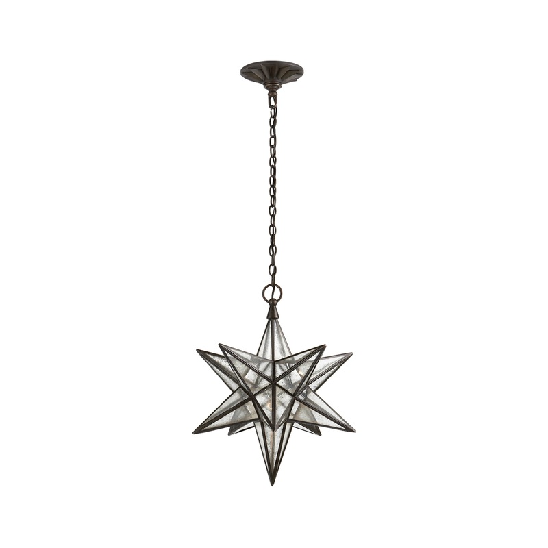 The Moravian Medium Star Lantern reimagines a timeless celestial motif with antiqued mirror glass and refined metal framing. A sculptural form suspended from a chain link canopy, this lantern casts brilliant reflections and offers ambient glow from every a