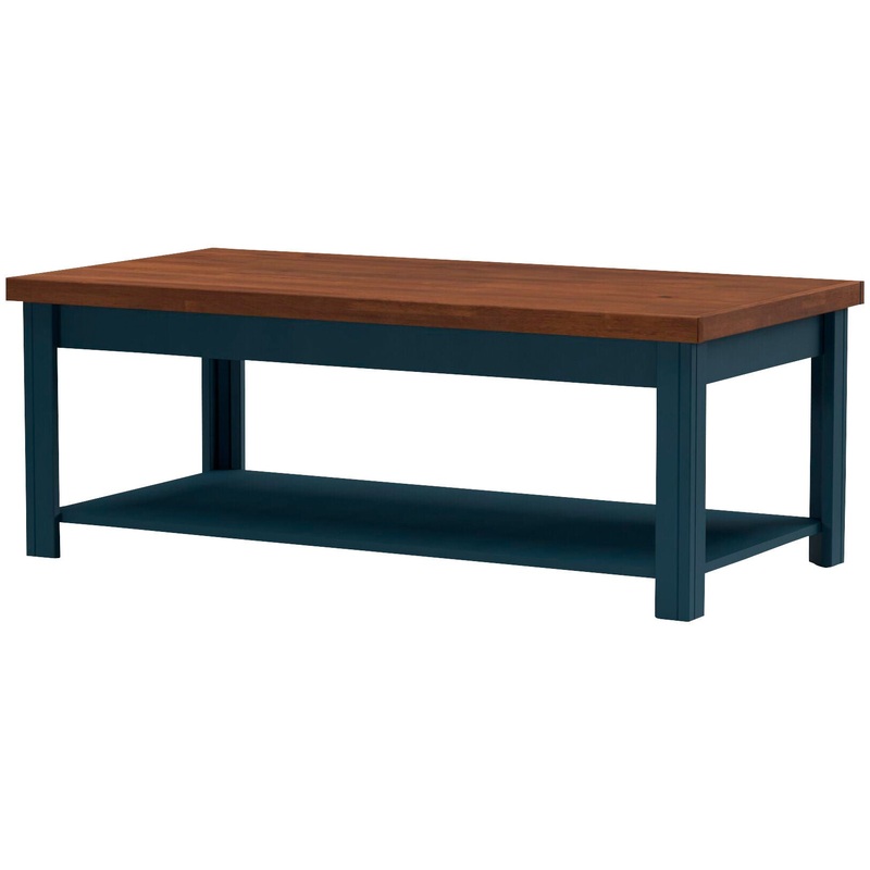 The beautiful two-tone Nantucket Coffee Table is brought to us by the innovators at Legends Furniture. With a beautiful whiskey-colored tabletop and a blue-denim-colored body, you won't find a similar piece anywhere. There is a space for open storage below