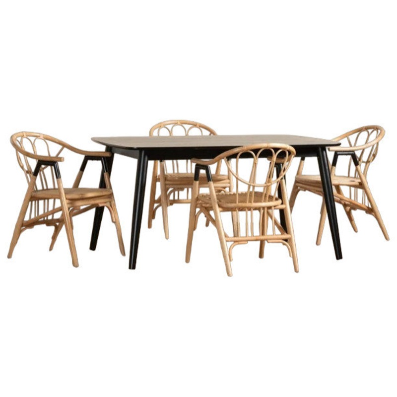 -This bohemian set includes four chairs and one table. -Each chair is handcrafted from natural rattan and is fitted with convenient armrests to encourage casual relaxation. -Constructed from Rubber Wood, Engineered Wood, Natural Rattan, and Metal -Overall