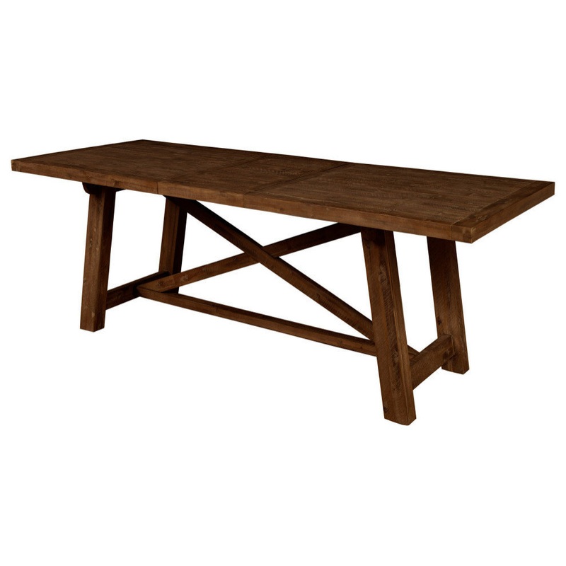 With a beautiful medium brown distressed salvaged wood finish, bring rustic elegance to your dining room with the Newberry Dining Table. A removable leaf lengthens the table from 88 inches to 103 inches, making ample room to seat eight. Using sustainable wood resources, this table is constructed with Acacia wood and built with angled legs with an x-design at its base for both aesthetic appeal and stability. Designed with hosting in mind, this dining table is styled well with a combination of a bench and dining chairs.
