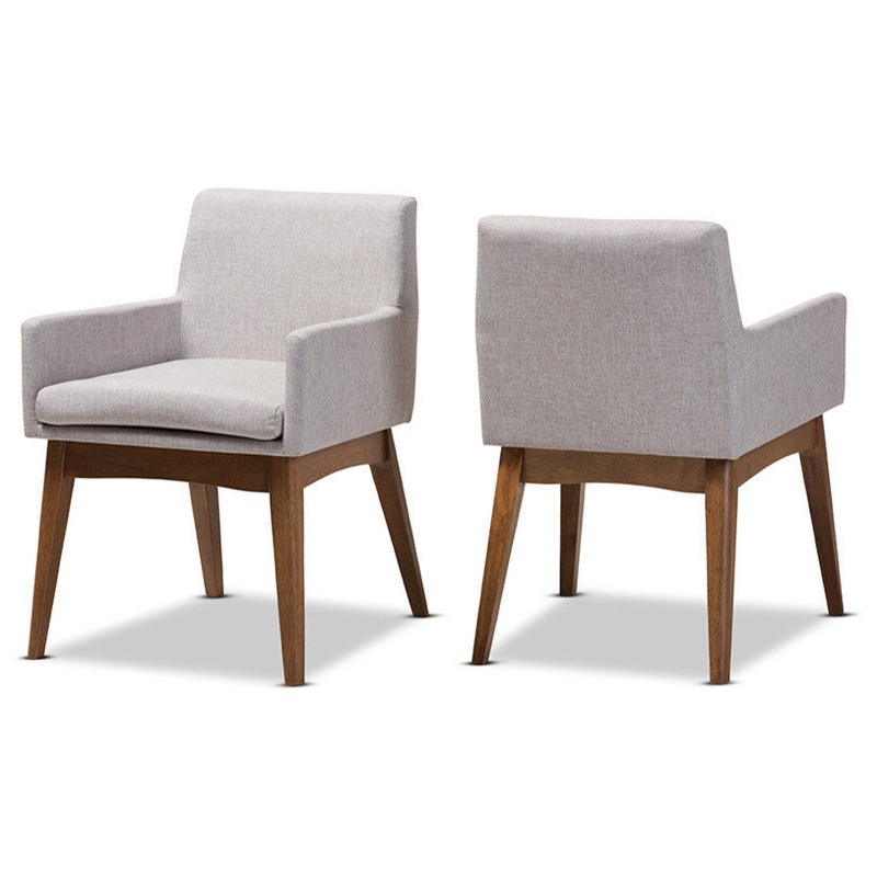 Enriched with finer detailing, the angular and cushioned Nexus dining armchair embraces comfort. Constructed of solid rubberwood frame in dark walnut finishing, the Nexus is upholstered in grayish beige polyester fabric. It’s splayed leg design sets the stage for a mid-century modern appeal to your dining room. Comfortable foam padded seat and back for lasting comfort in enjoying everyday family dinners. Medium seat back that seamlessly tapers down creates a look of modern aesthetic. Made in Malaysia, the Nexus dining armchair requires assembly.