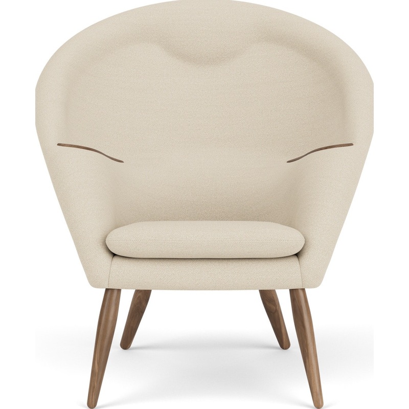 The cocooning horseshoe form of the Oda Lounge Chair (1956) reveals exquisite detail. The masterfully integrated wood armrests and softly molded headrest and lumbar support were considered experimental in the 1950s, but remain hallmarks of designer Arnold Madsens approach. Although never formally trained, the Danish designers precision is evident in the chairs seamless details, like the hand-sewn upholstery that covers Odas complex curves and backrest. By enfolding the sitter, Oda creates a sheltering space to curl up and read, rest, and relax. Pair it with the Oda Ottoman for extra comfort. Made in Poland.