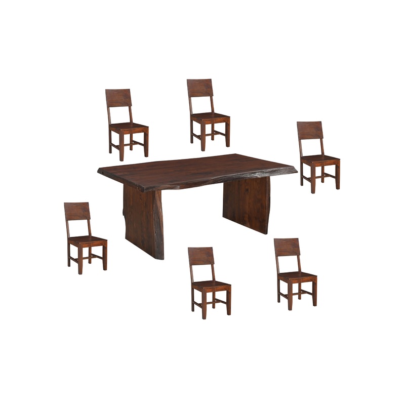 Transform your dining area with this stylish dining table set, featuring a rectangular live edge table supported by a double pedestal base. The table includes two removable leaves, allowing you to easily extend its length for extra seating. The set also includes matching dining chairs with solid backrests and gently scooped seats for added comfort and elegance. Each piece, crafted from solid acacia wood, showcases a rich, dark brown finish that highlights the wood’s inherent beauty. Perfect for both casual dinners and formal events, this dining set offers a blend of sophistication and utility, making it a lasting addition to your home decor.