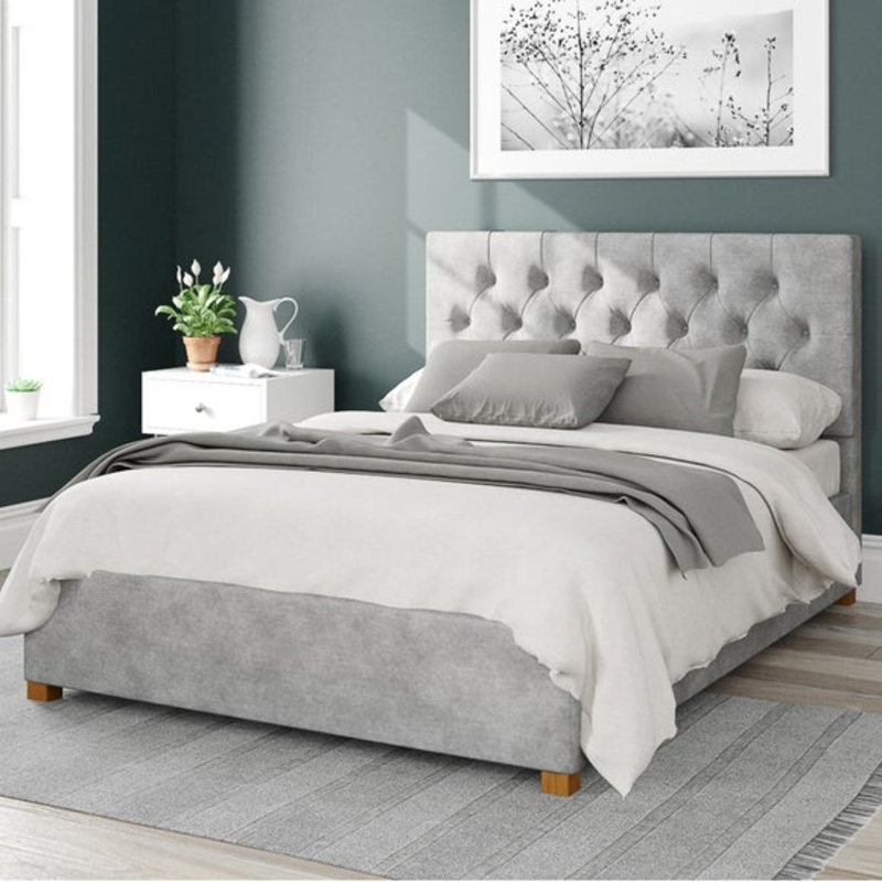 Enjoy a comfortable nights sleep while knowing youve maximised your storage potential with this stylish and functional ottoman bed from the Olivier range. Hand upholstered with the choice of a beige or silver coloured linen fabric, the Chesterfield inspired headboard with deep padding, and statement deep buttoned details creates a timeless style and offers an effective storage and sleeping solution. Manufactured in the UK, it features quality spring slats that provide added support for a peaceful night’s sleep and the large storage area is designed to provide ample space for all your bedding and accessories. The ottoman design can be easily accessed with gas lift pistons, so once the mechanism is open it will hold in place and a fabric dust protection sheet is there to keep your belongings clean and tidy. Complete with solid hard wood feet to provide a stable foundation and ensure the bed remains sturdy and secure, they also add a stylish touch to the overall design.