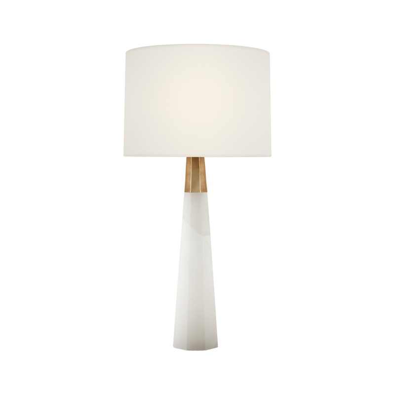 The Olsen Table Lamp blends modern geometry with refined detailing. Its tapered base in crystal or alabaster is accented with a sleek metal collar, topped by a round linen shade that softens the overall profile. Ideal for bedsides, consoles, or reading cor