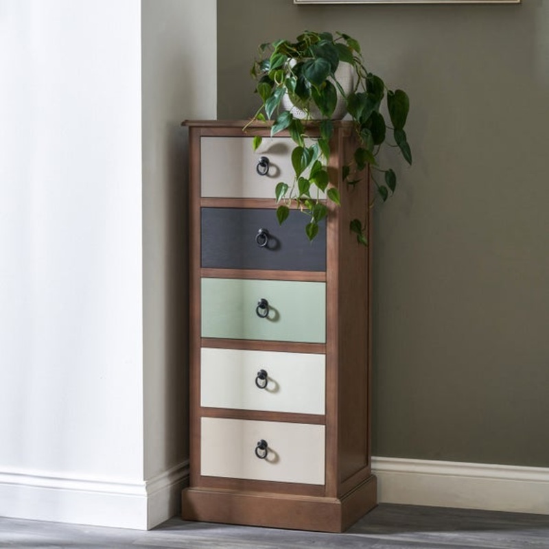 A true statement piece, this drawer unit effortlessly marries raw industrial elements with modern design, creating an irresistible blend of functionality and aesthetic allure. Crafted with a robust MDF and pine frame, this chest of drawers not only guarantees longevity but also beckons with a sophisticated charm. The gleaming zinc alloy handles provide an elegant touch, while the on-trend multicoloured finish infuses your space with contemporary vibrancy.